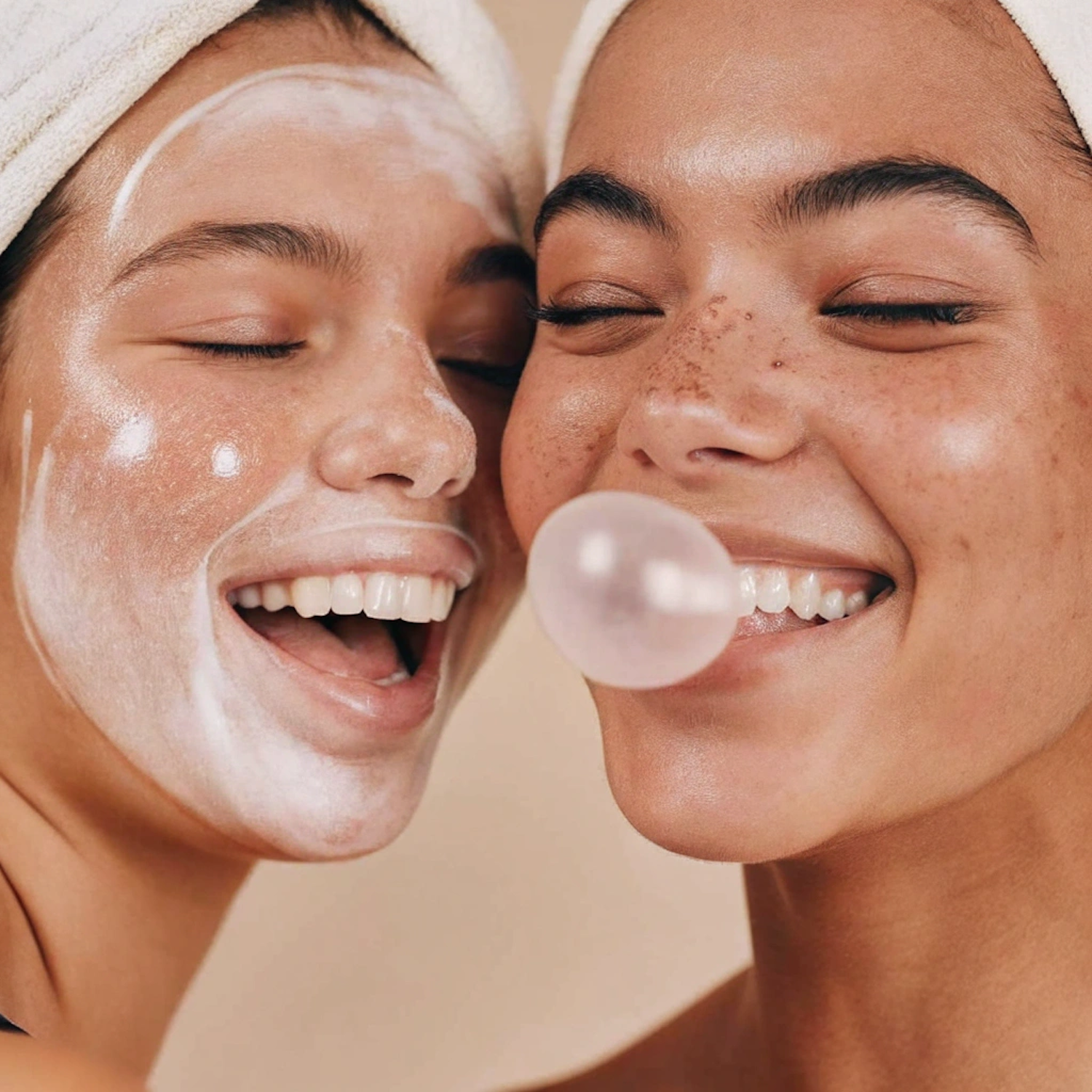 Two women share a playful moment with glowing skin, one with a face mask and the other blowing a bubblegum bubble. Radiant and fun vibes!