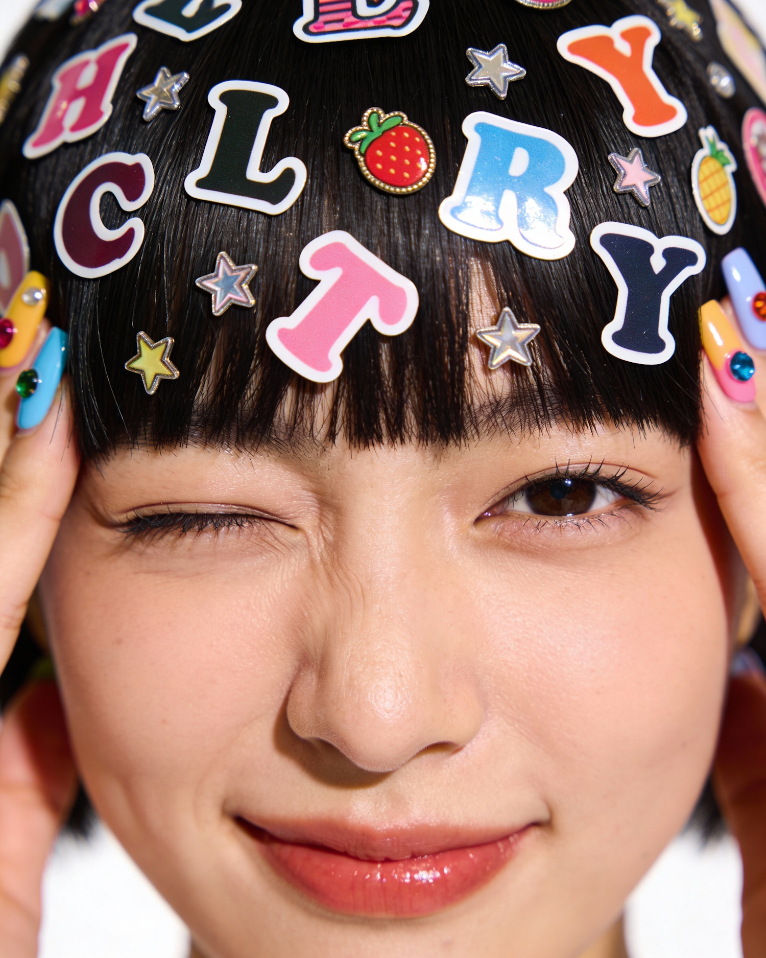 Close-up of a person with colorful stickers on their hair, vibrant nails, and a playful expression, showcasing creativity and fun.