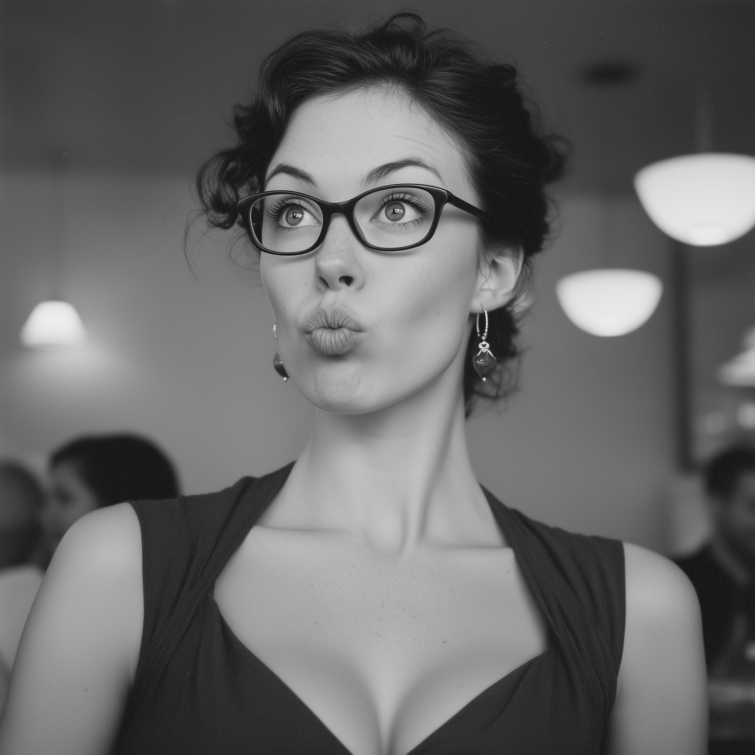 Playful black-and-white portrait of a woman with glasses and earrings, pursing her lips in a lively indoor setting.