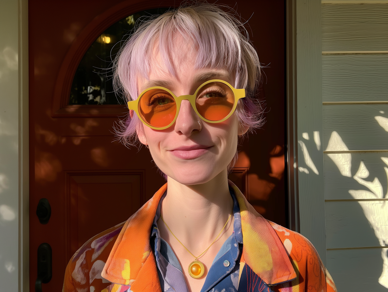 Person with pastel purple hair and yellow sunglasses in vibrant jacket, standing by a red door with dappled sunlight.