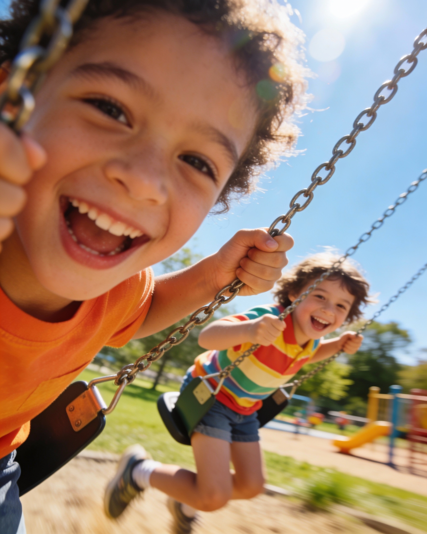 Two children laughing and swinging on a sunny day at the park, enjoying the moment with bright smiles and vibrant colors.