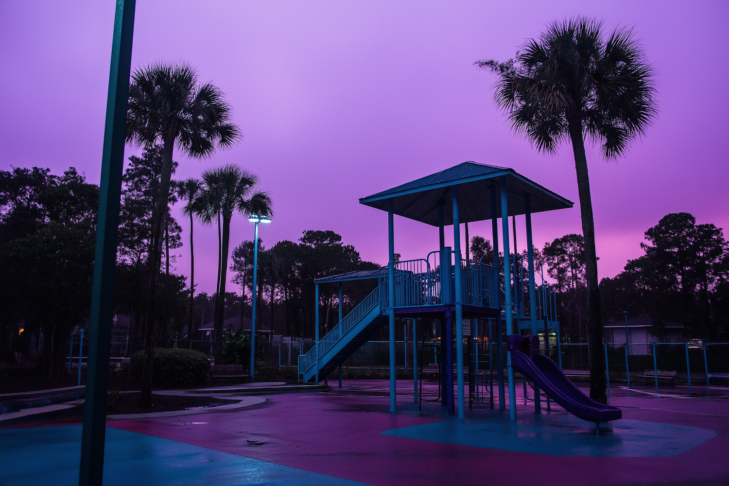 Twilight playground with blue equipment, palm trees, and a vivid purple sky. Wet reflective ground adds a serene, surreal ambiance.