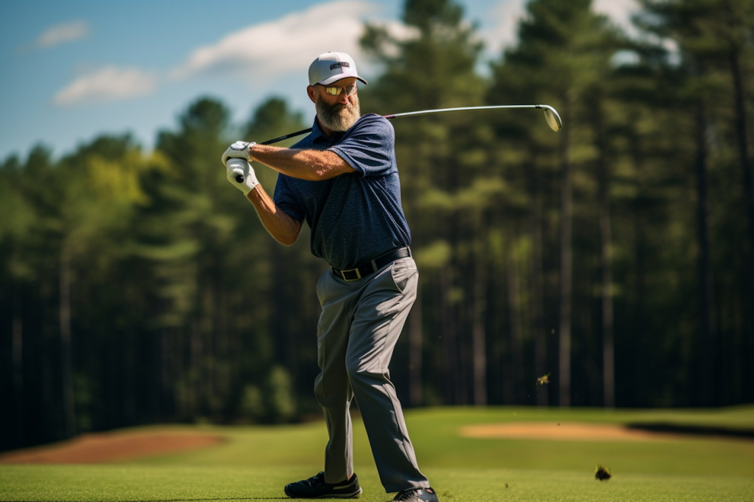 Bearded golfer in mid-swing on a lush course, wearing a cap and sunglasses, surrounded by trees and clear skies.