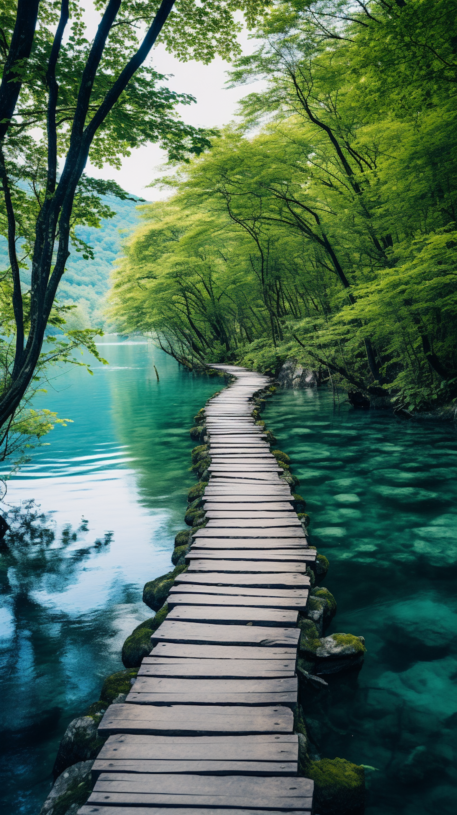 Serene wooden pathway over a turquoise lake, surrounded by lush green forest. Tranquil and inviting natural beauty.