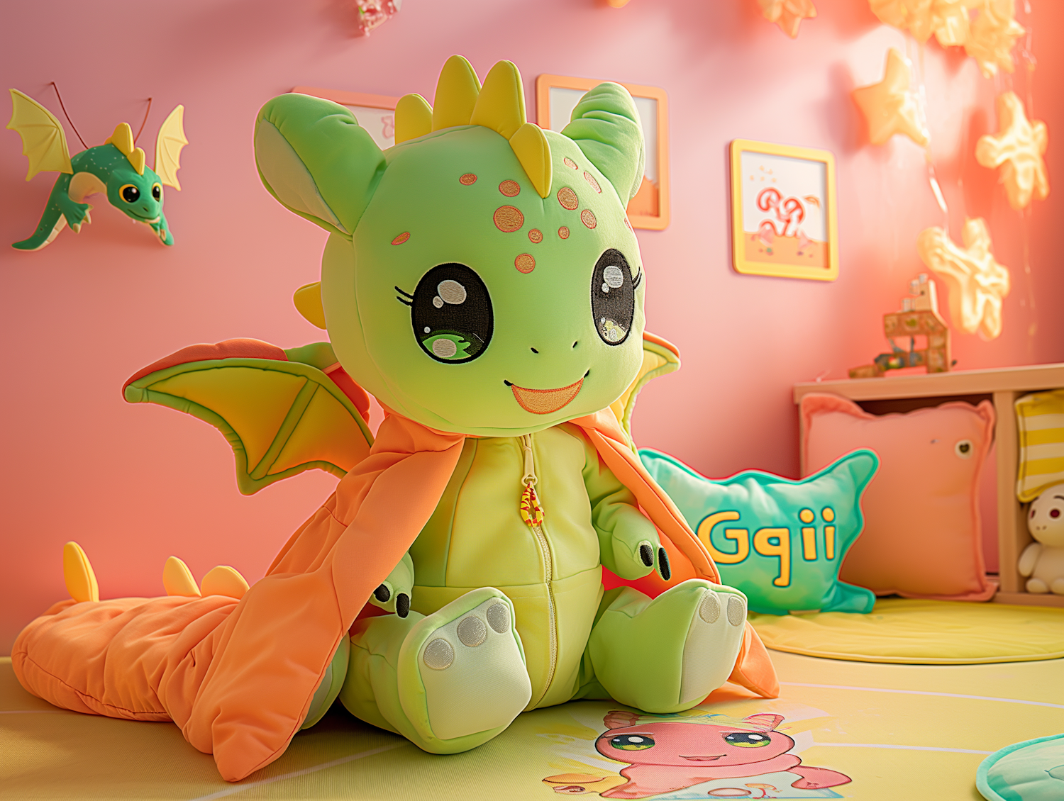 Adorable plush dragon toy in a colorful children's room with pastel decor and playful accents.
