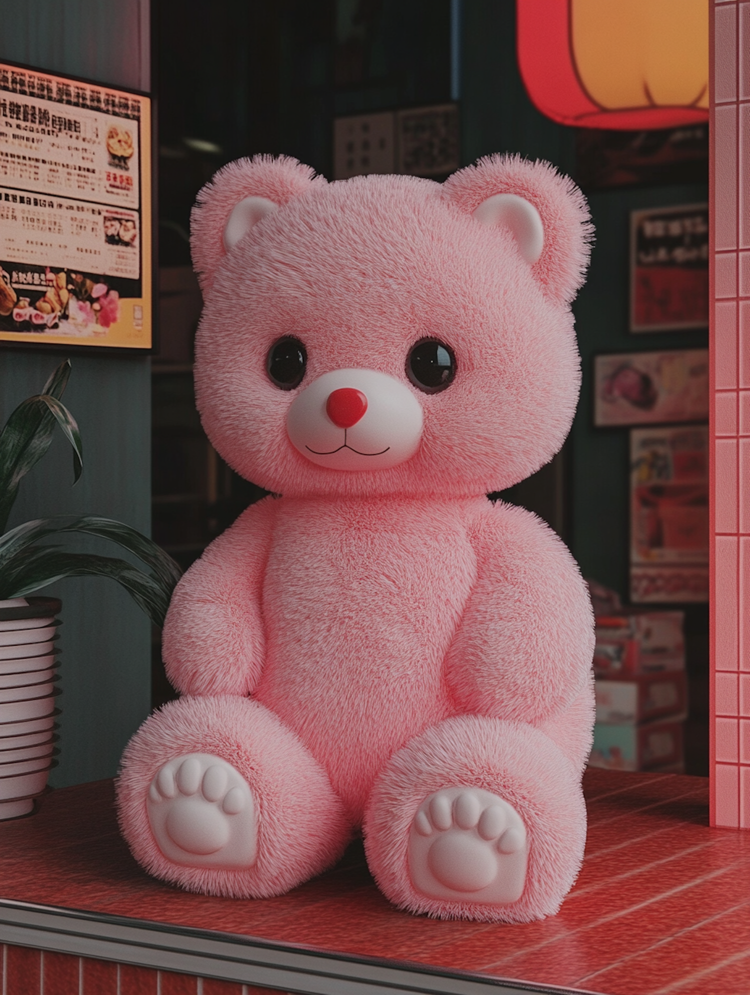 Adorable pink teddy bear on a red-tiled surface with a cozy interior backdrop featuring a menu and a red lantern.