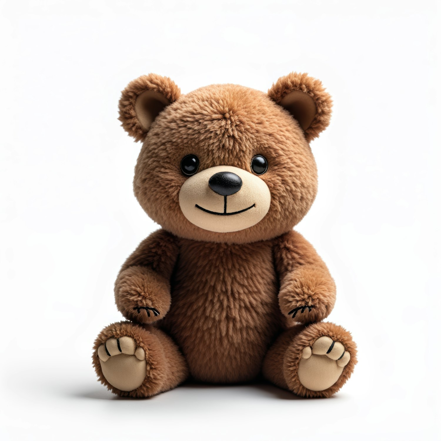 Adorable brown plush teddy bear with shiny black eyes and a friendly smile, sitting against a white background.