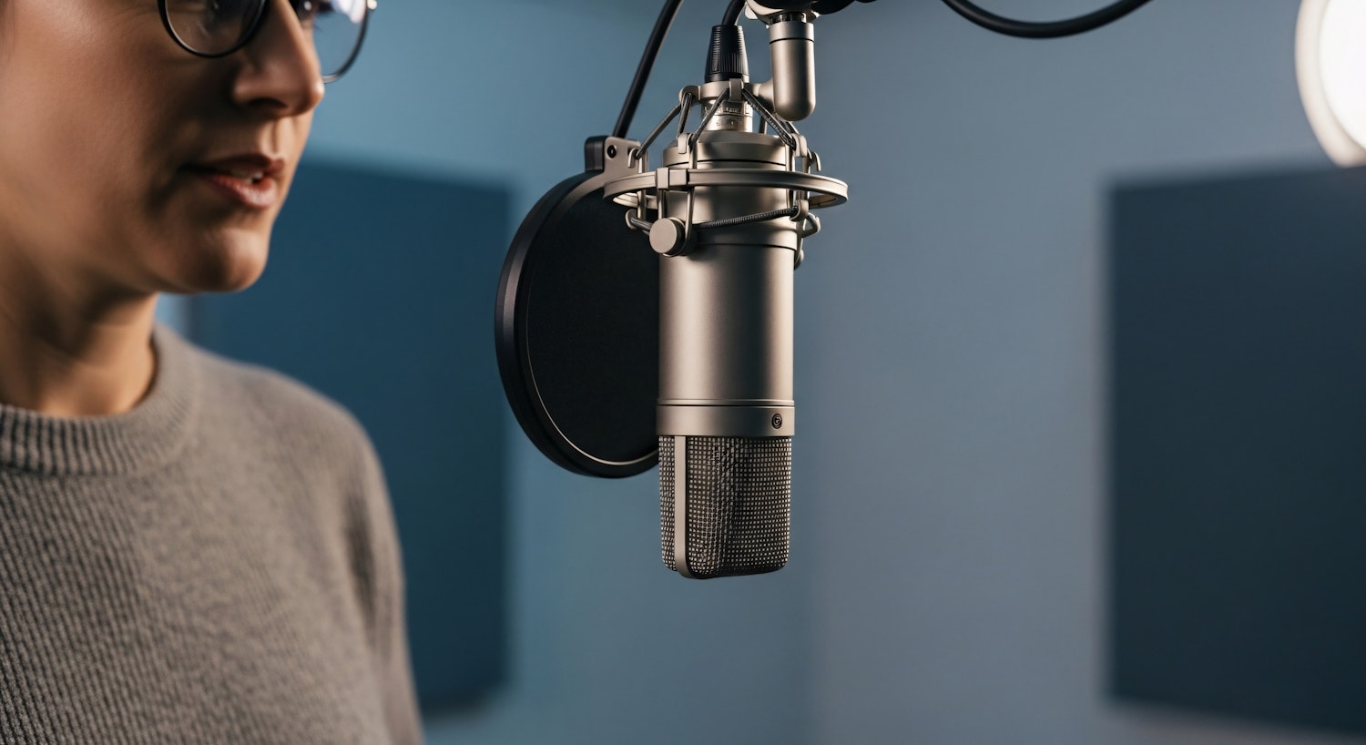 Close-up of a professional microphone setup with a person speaking, set in a modern recording studio with a blue background.