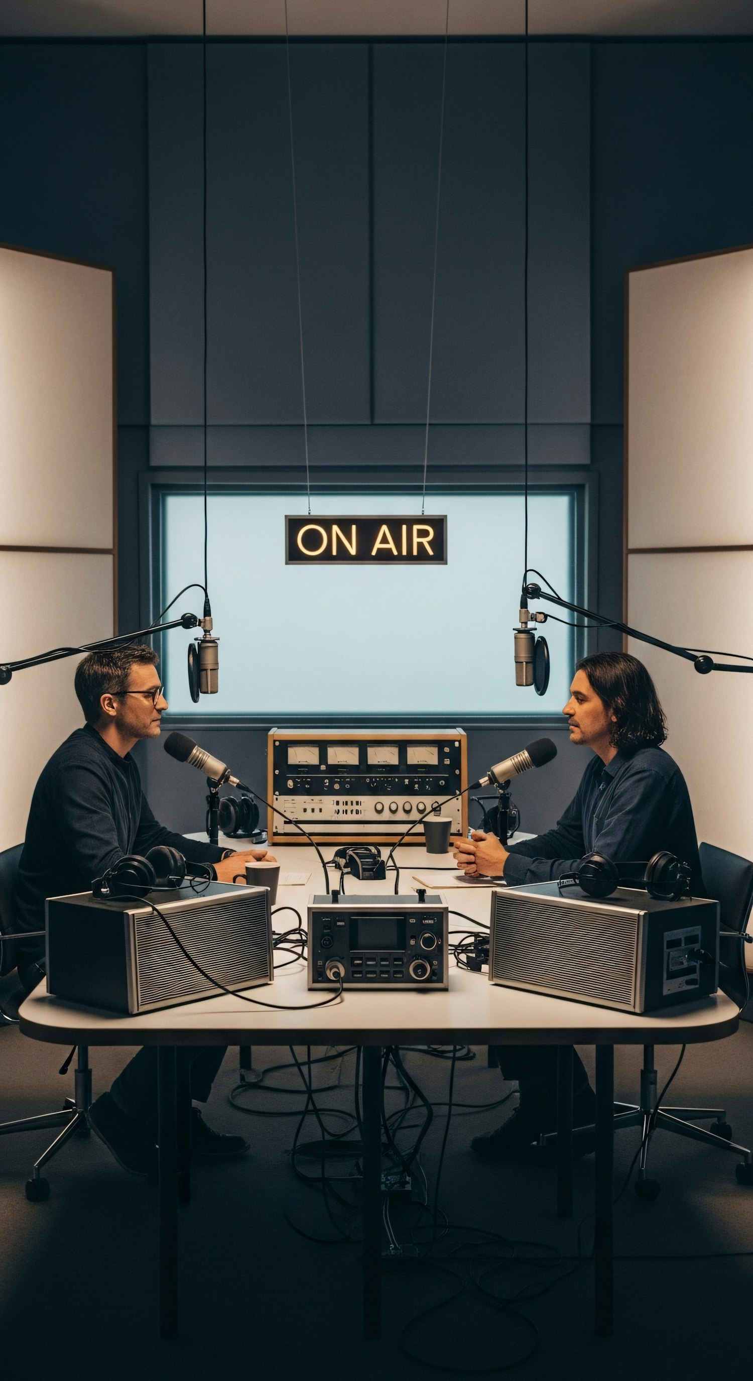 Two men recording a podcast in a modern studio with microphones, audio equipment, and an 'ON AIR' sign in the background.