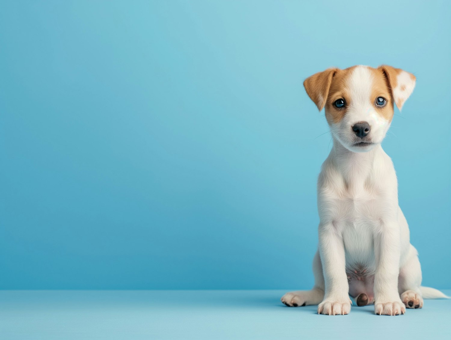 Adorable puppy with white and tan fur sits against a light blue background, showcasing its curious expression and floppy ears.