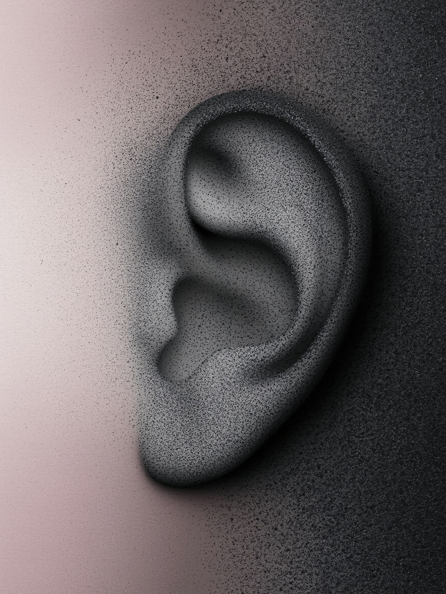 Artistic rendering of a human ear using pointillism, with a gradient background from pink to gray, emphasizing texture and depth.