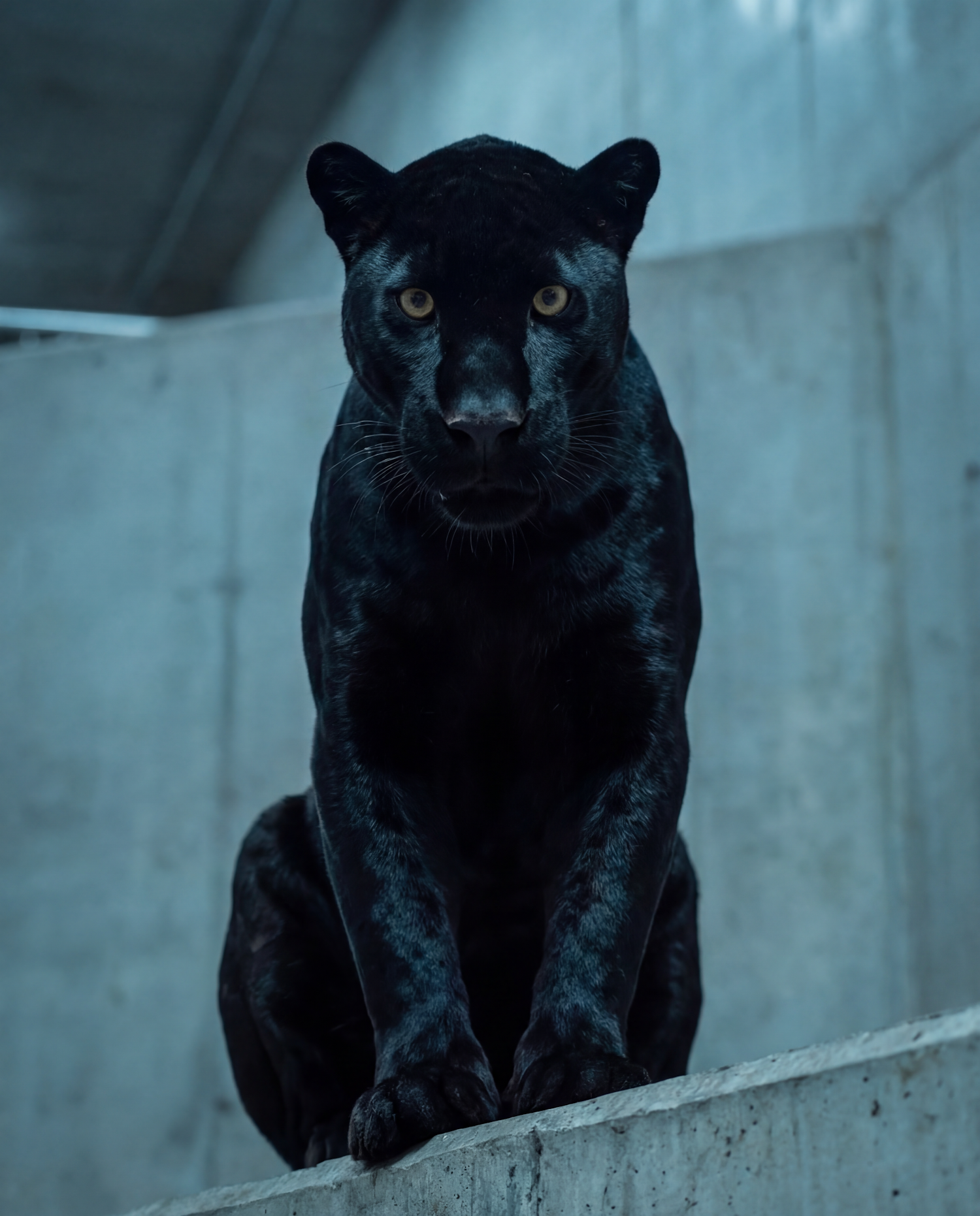 A black panther with piercing yellow eyes sits on a concrete ledge in a dimly lit, industrial setting, exuding a sense of power and mystery.