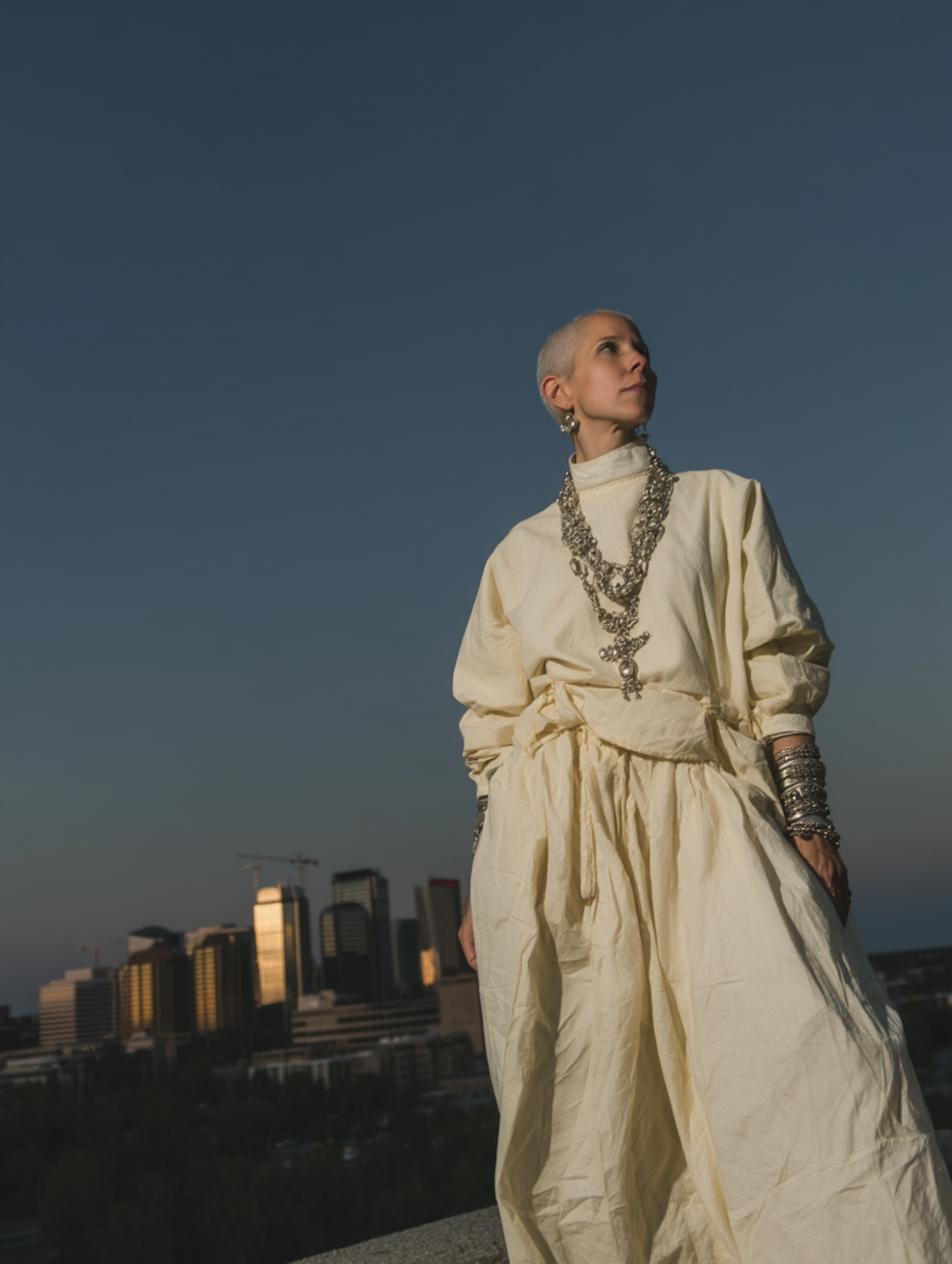 Individual in minimalistic attire stands gracefully under a city sunset, accessorized beautifully, against a vibrant urban backdrop.