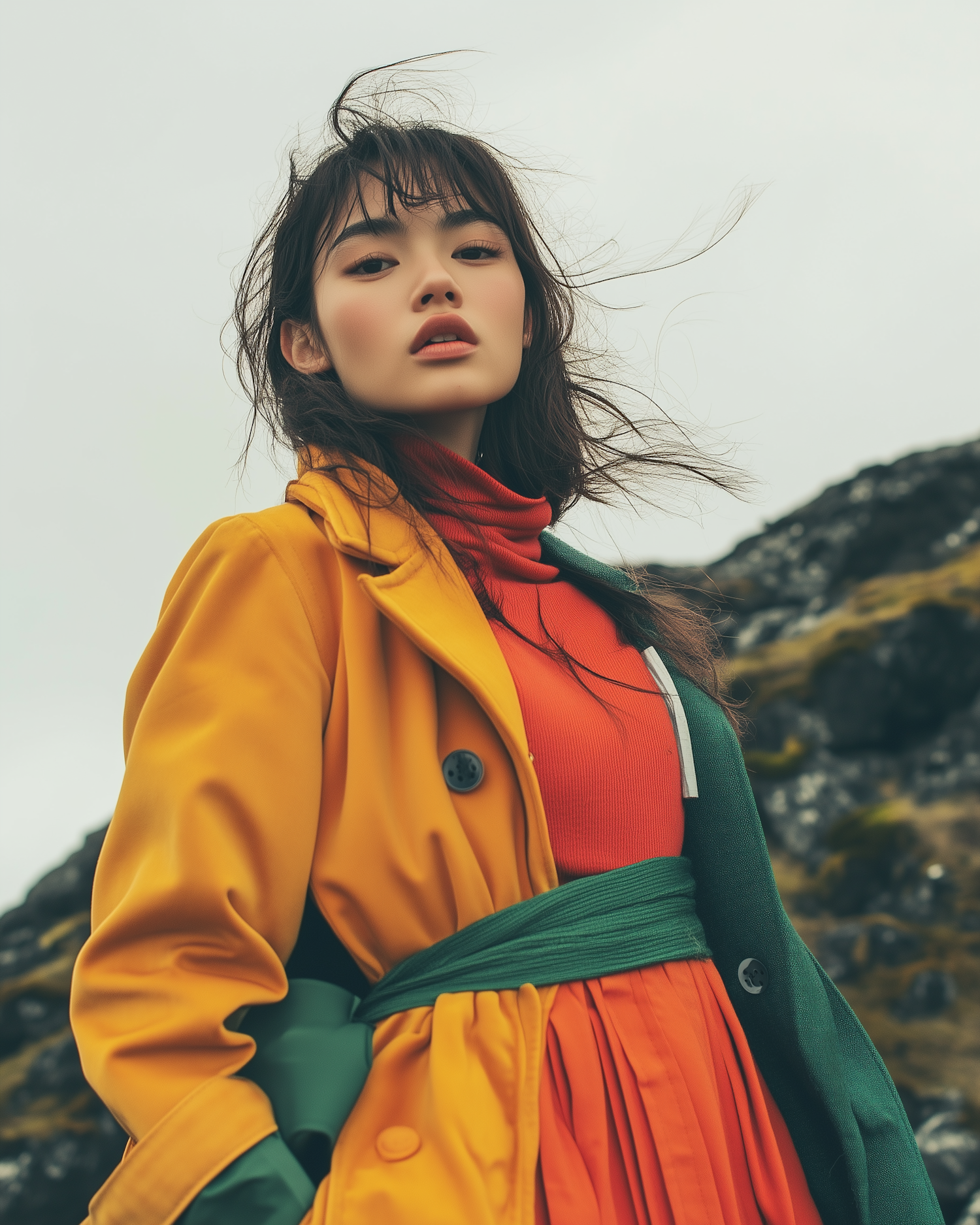 Stylish woman in vibrant yellow, red, and green outfit poses confidently outdoors against a cloudy sky and rocky terrain.