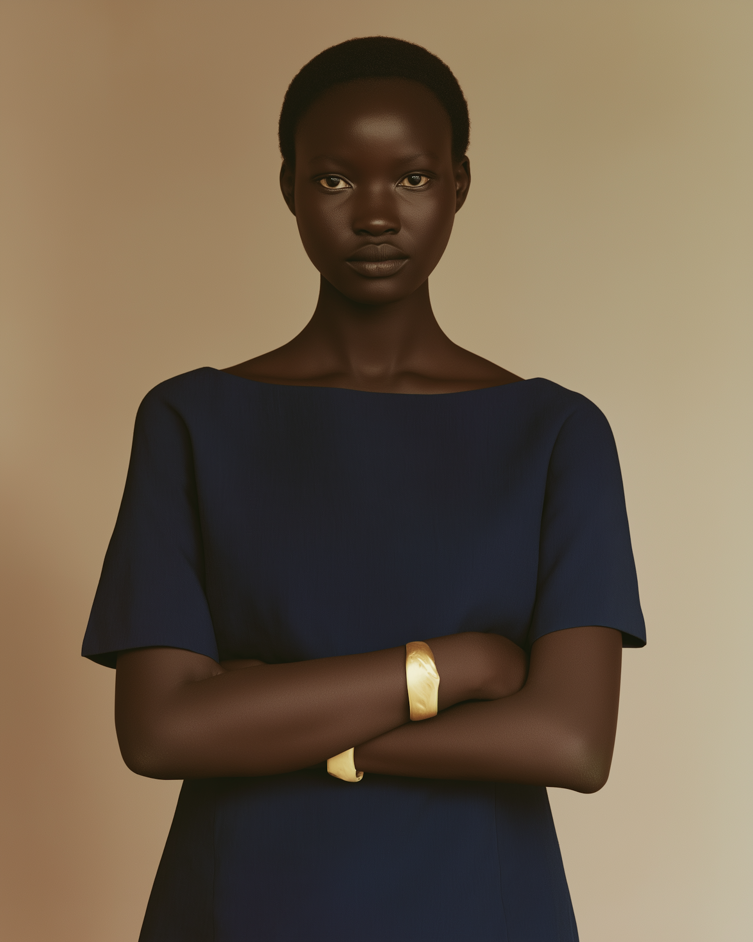 Elegant Black woman in a dark blue dress with a gold bracelet, exuding confidence and poise against a neutral background.