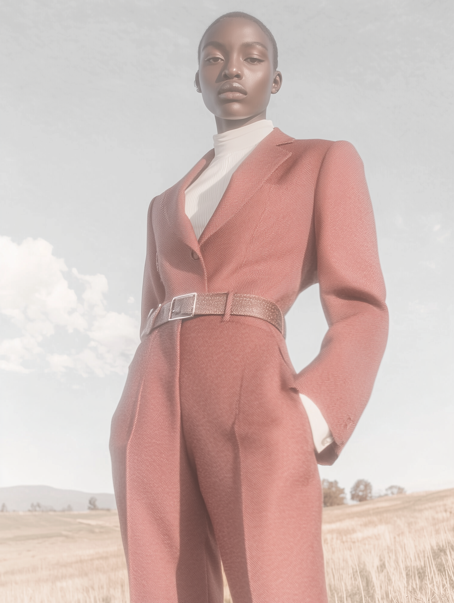 Elegant Black woman in a rust suit and white turtleneck, standing confidently in a serene open field.