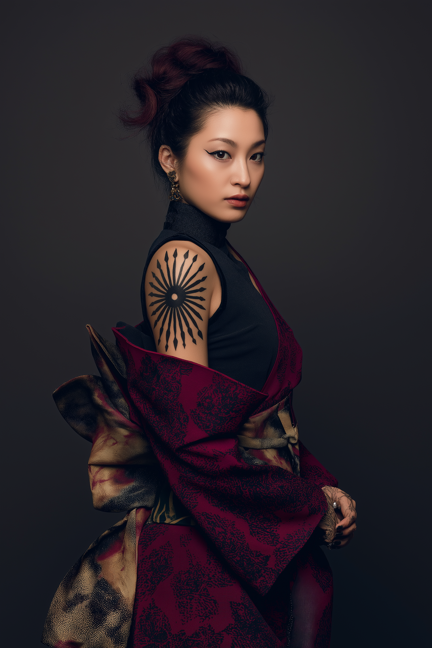 A poised individual in a decorated crimson and gold outfit with a geometric tattoo on their shoulder, captured in a sophisticated indoor setting.
