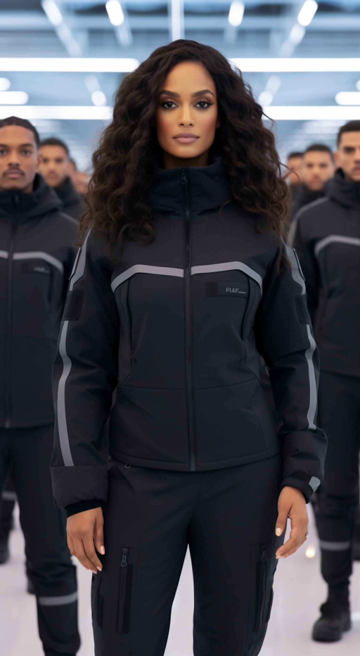 Confident woman leads a group in matching black uniforms in a futuristic setting, exuding strength and unity.