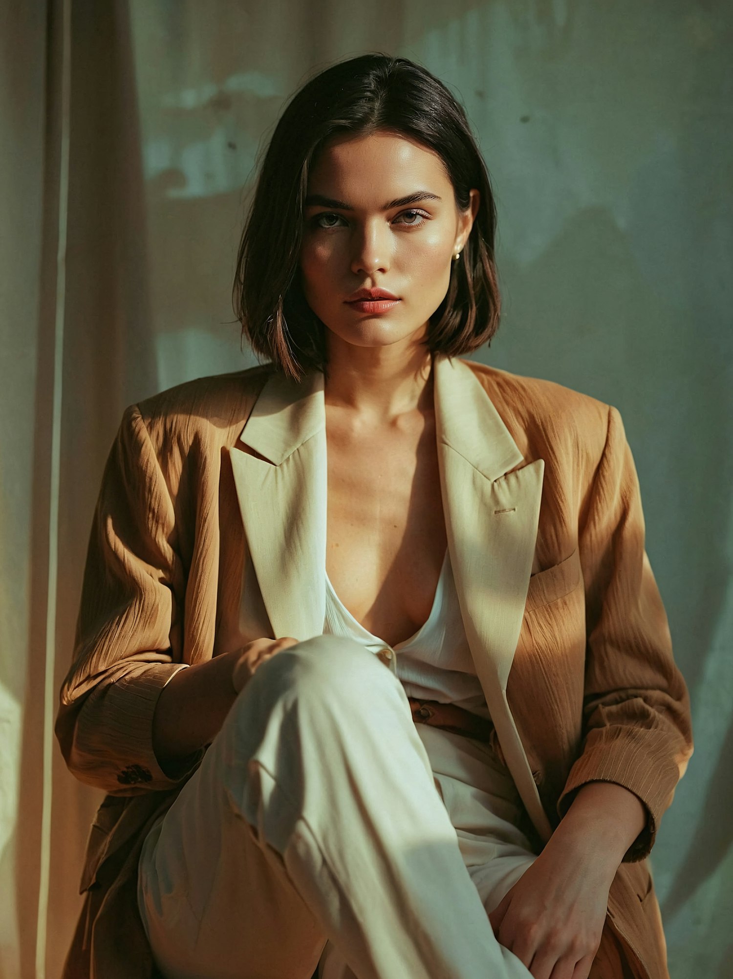 Elegant woman in a light brown blazer and white top, sitting confidently with a poised expression against a muted background.
