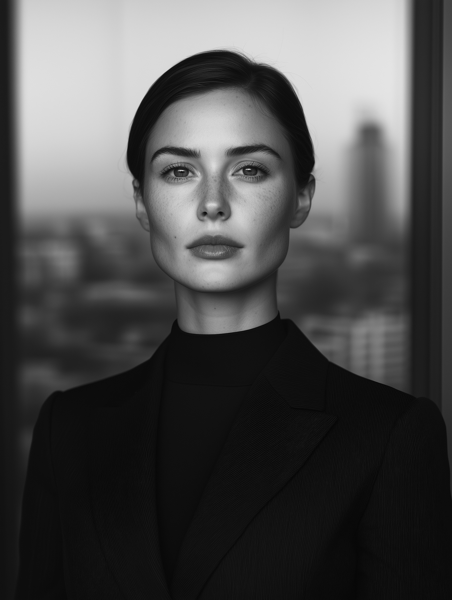 Black-and-white portrait of a poised woman in formal attire, with a blurred urban cityscape in the background.
