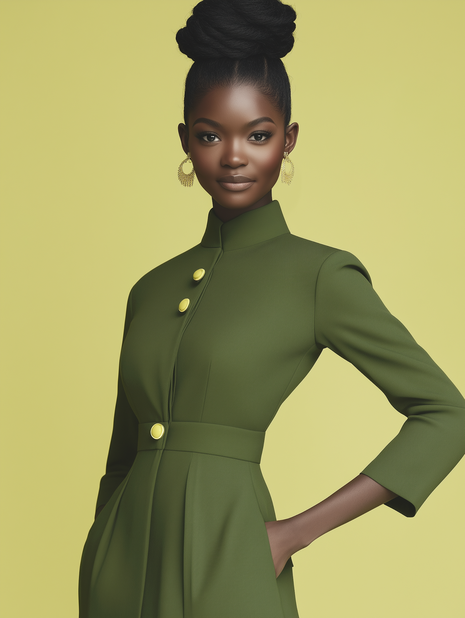 Elegant Black woman in olive green dress with gold earrings, styled hair, and serene expression against a light green background.