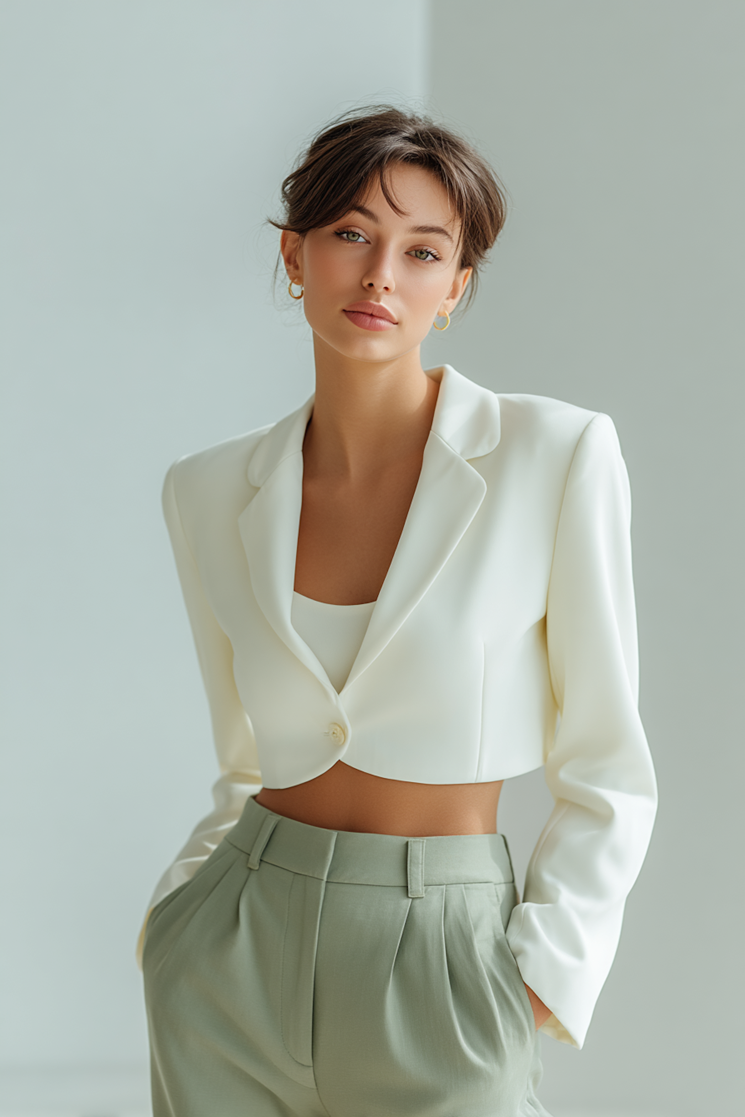 A stylish woman in a white cropped blazer and sage green trousers poses confidently in a minimalistic setting.