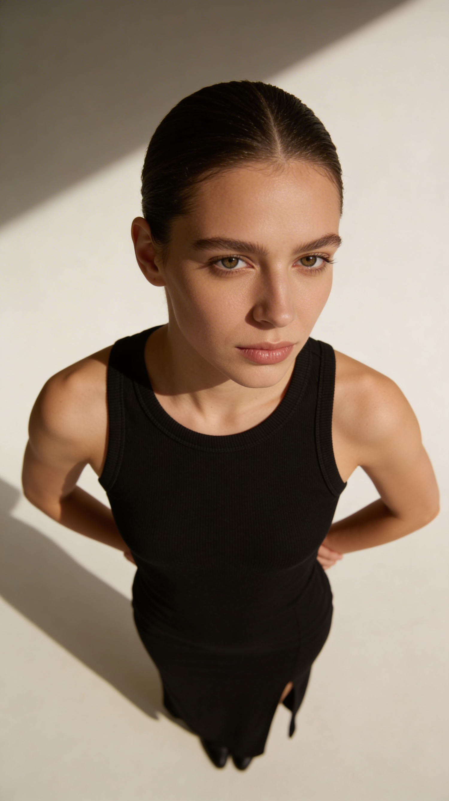 A woman in a black sleeveless dress stands confidently in soft lighting, her hair tied back and her expression calm and focused.
