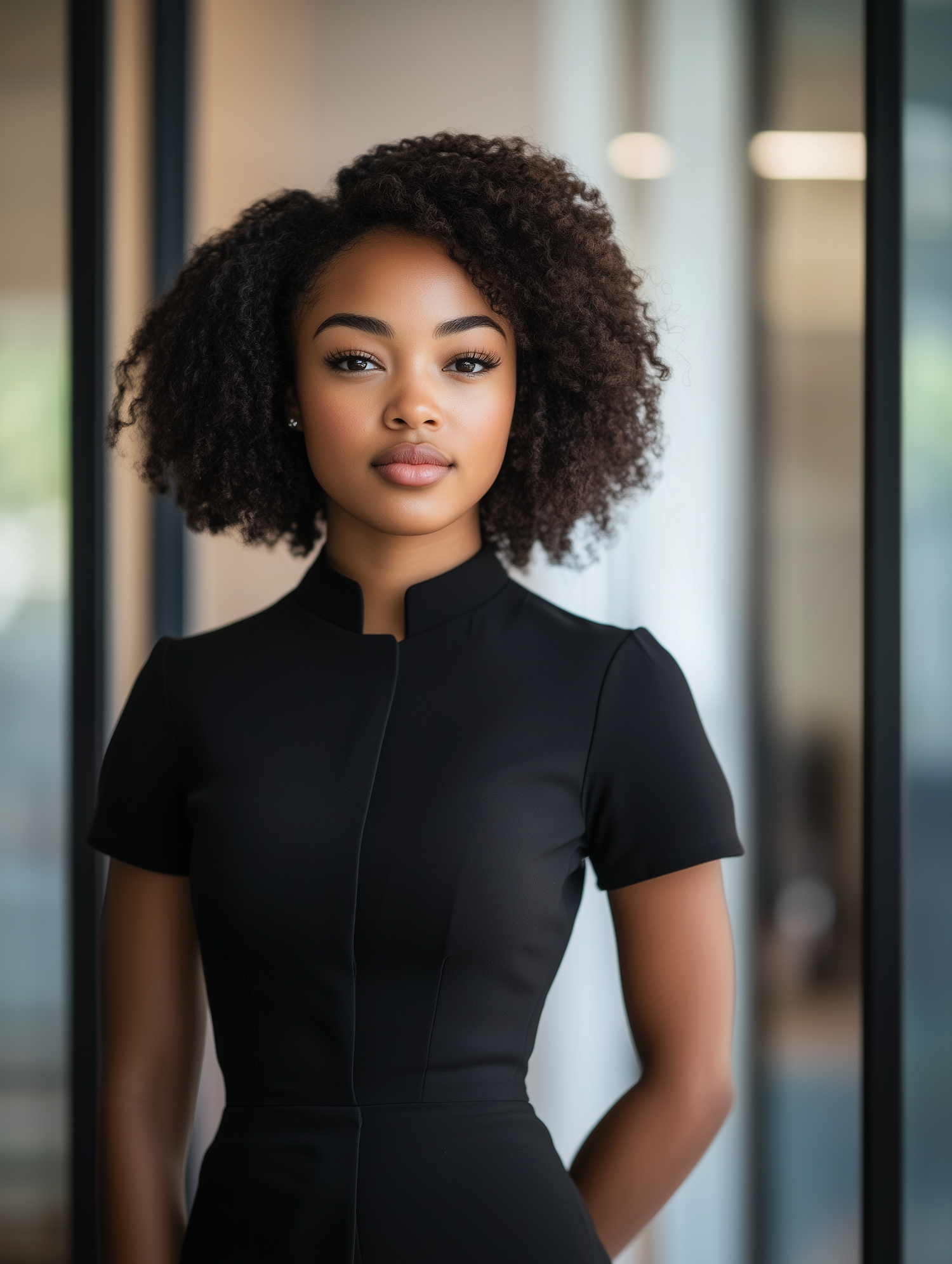 Confident young Black woman in a sleek black dress, standing indoors with natural light highlighting her curly hair and poised expression.