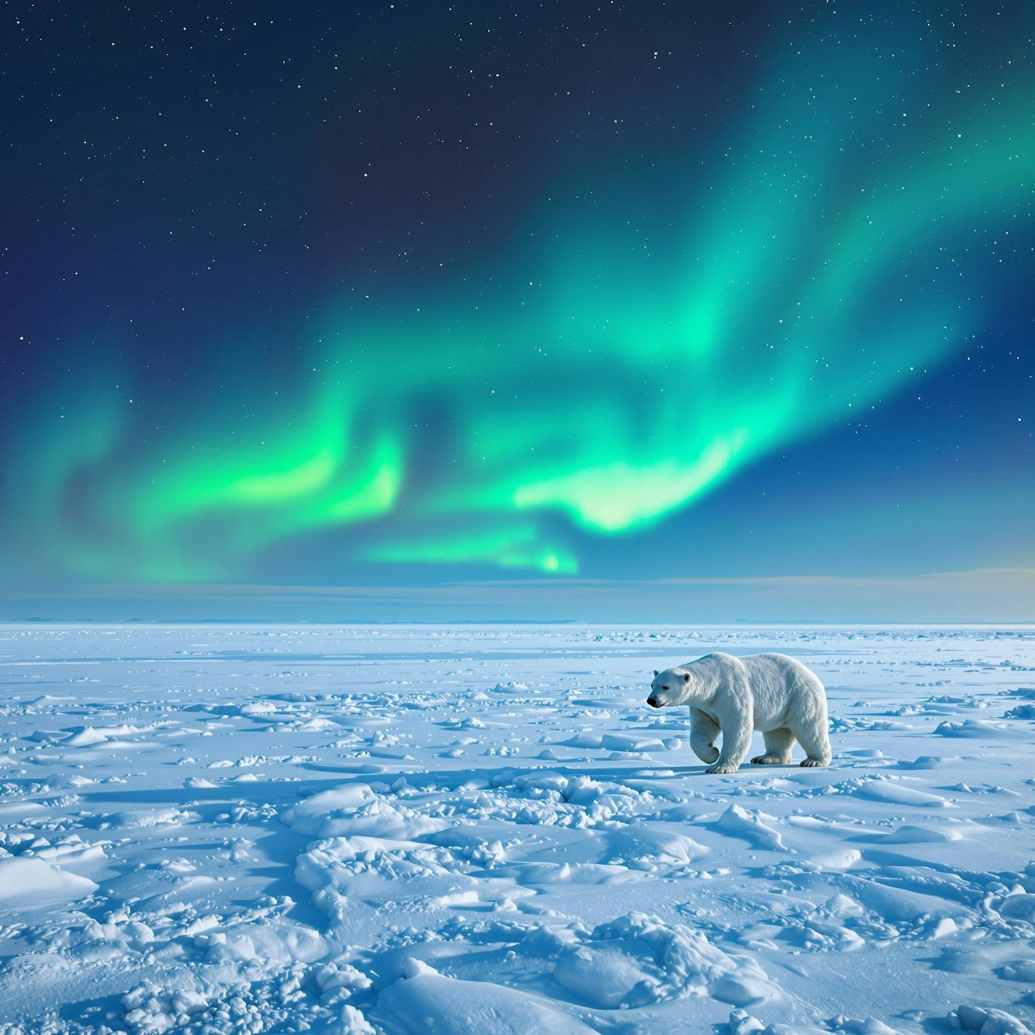 A polar bear walks on icy terrain under the vibrant green northern lights in the Arctic, creating a stunning and serene natural scene.
