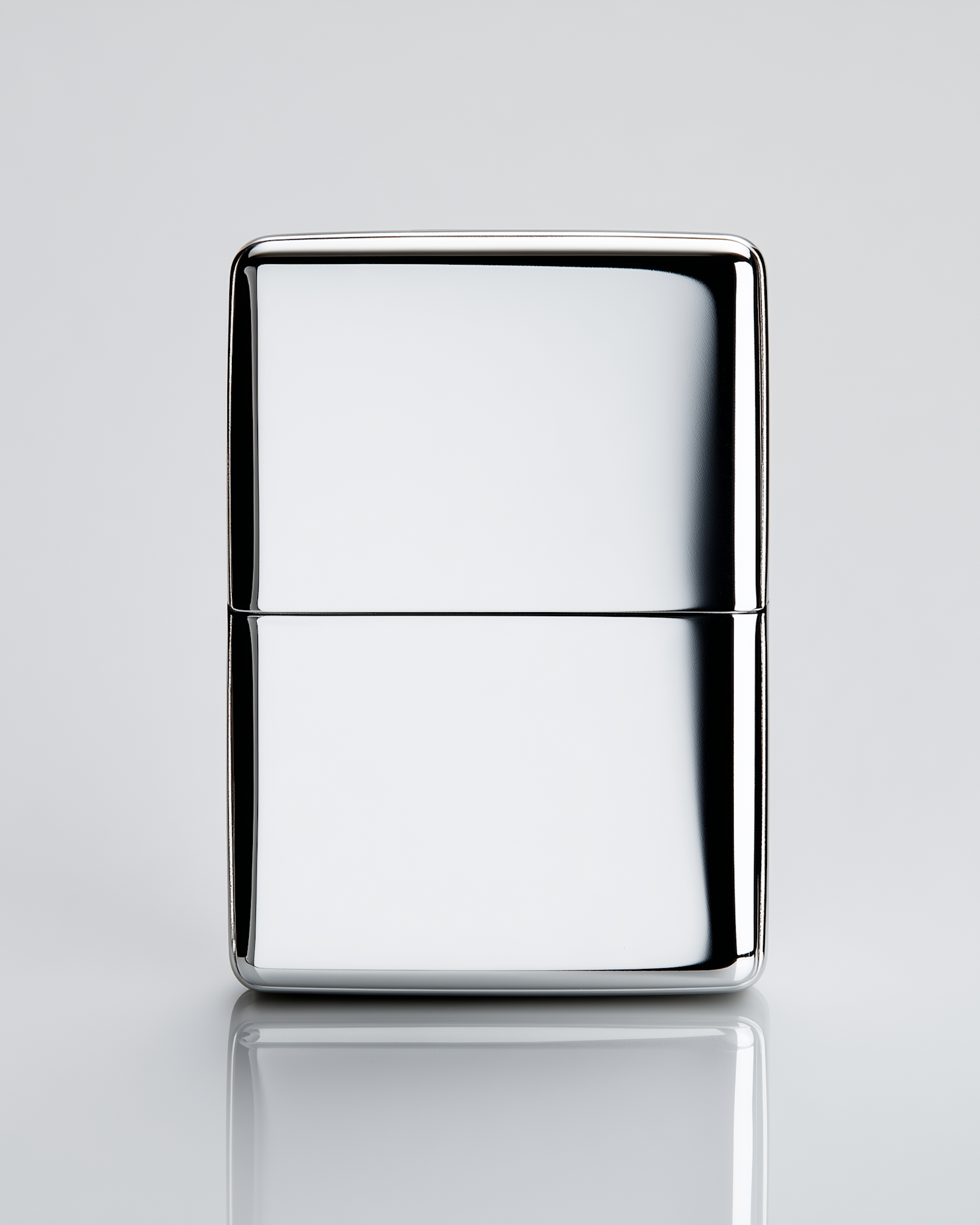A polished chrome lighter with a sleek, reflective finish, showcasing a modern and minimalist design against a neutral background.