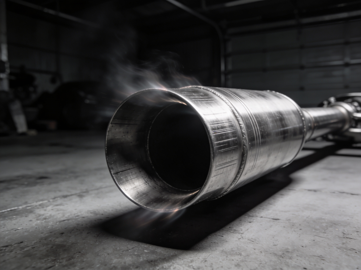 Close-up of a metallic exhaust pipe in a dimly lit garage, with faint smoke emanating, emphasizing its industrial design.