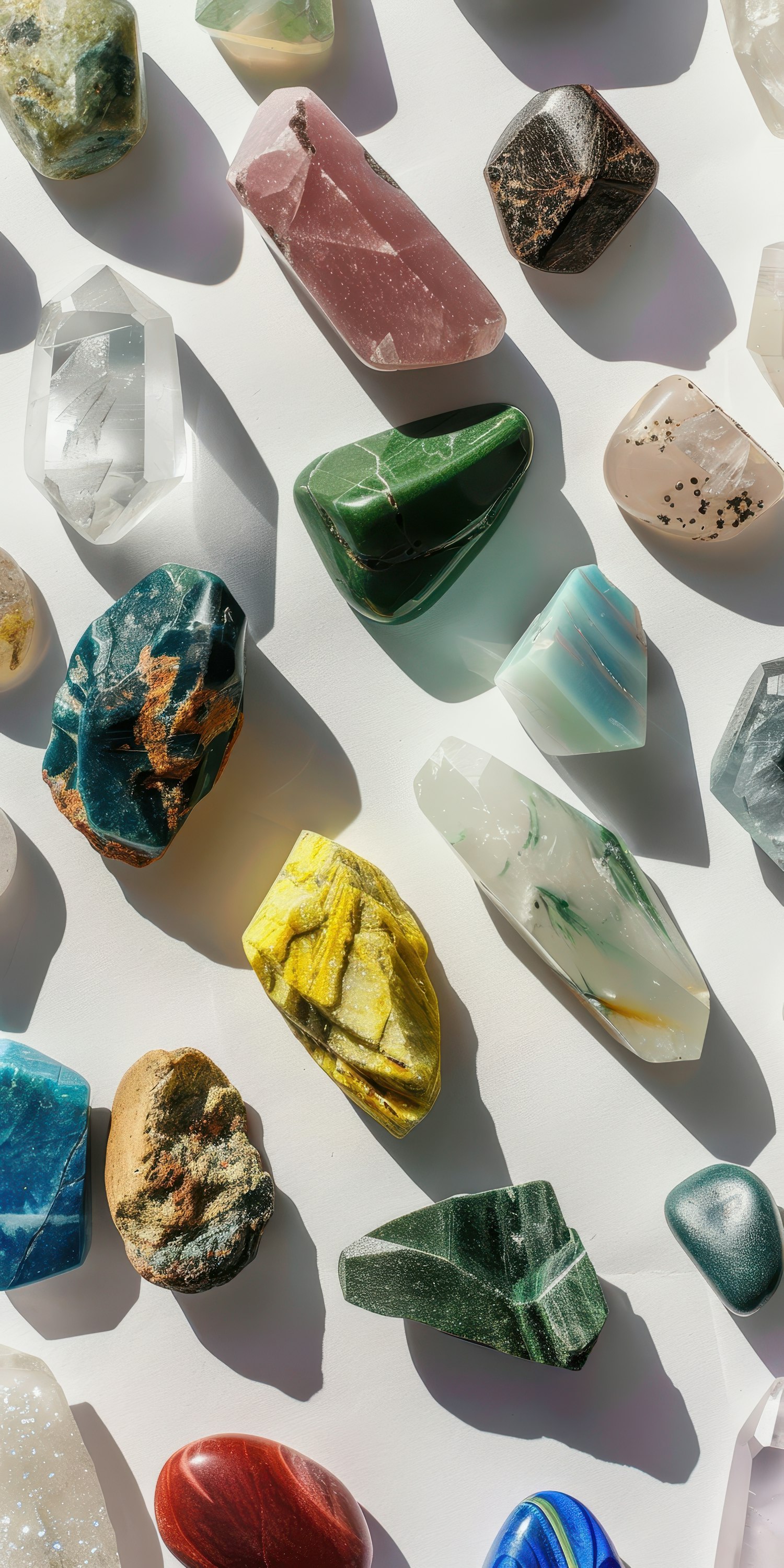 A vibrant collection of polished gemstones on a white surface, showcasing diverse colors and textures in natural sunlight.