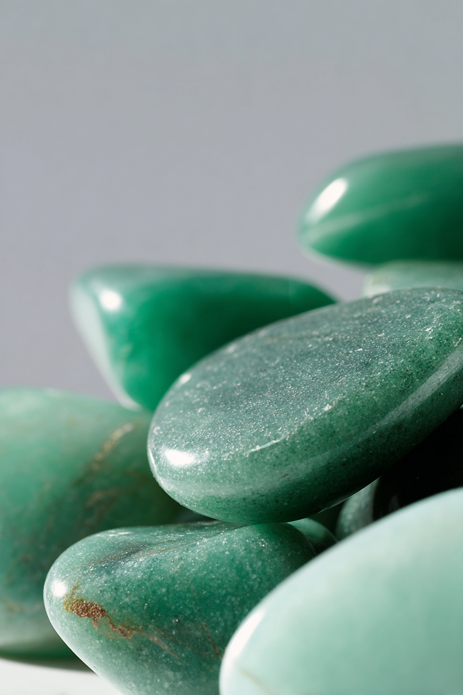 A close-up of smooth, polished green stones with a glossy texture, arranged in a minimalist composition to highlight their natural patterns.