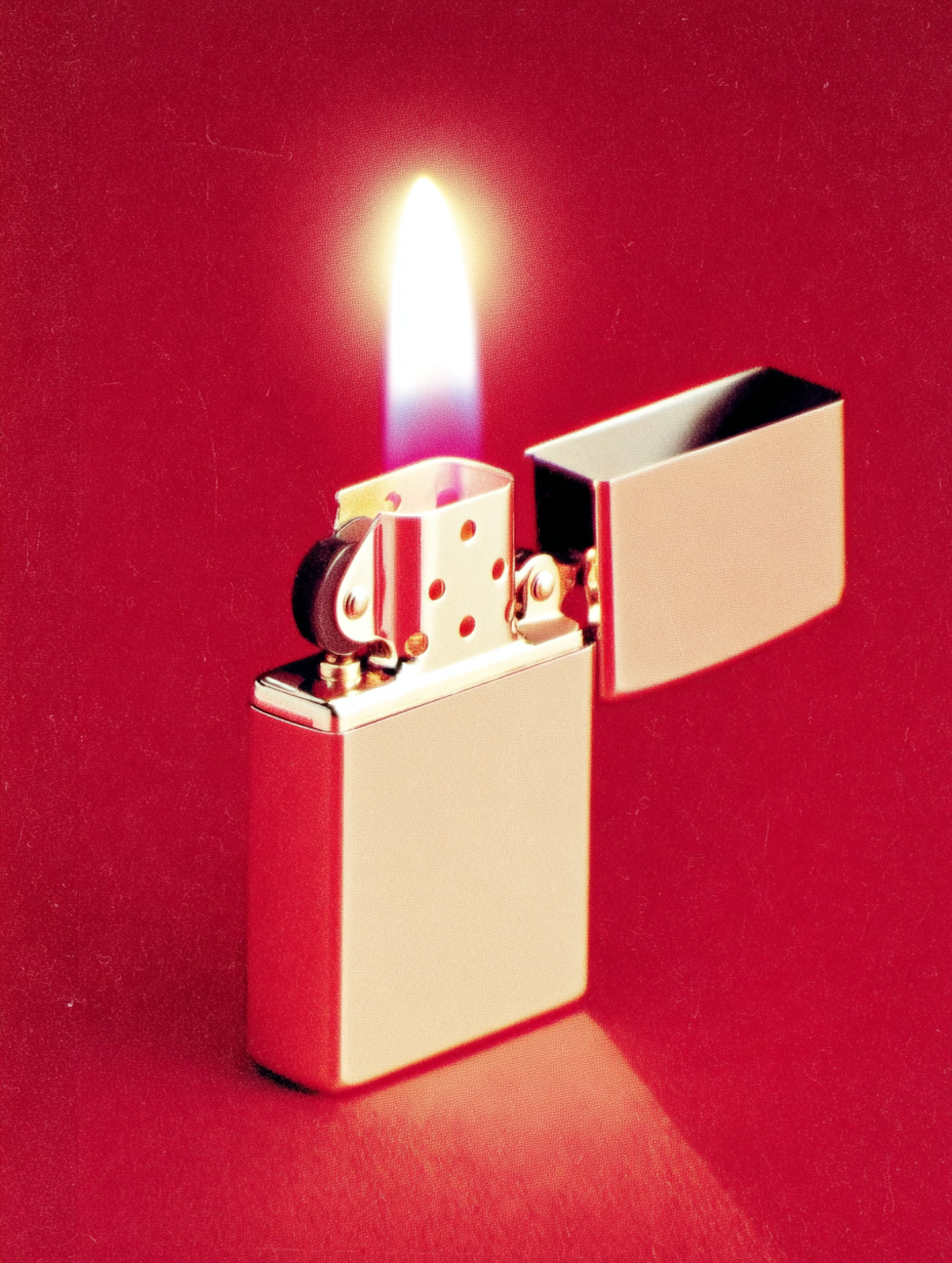 A polished metallic lighter with a lit flame against a vibrant red background, showcasing a minimalistic and striking composition.