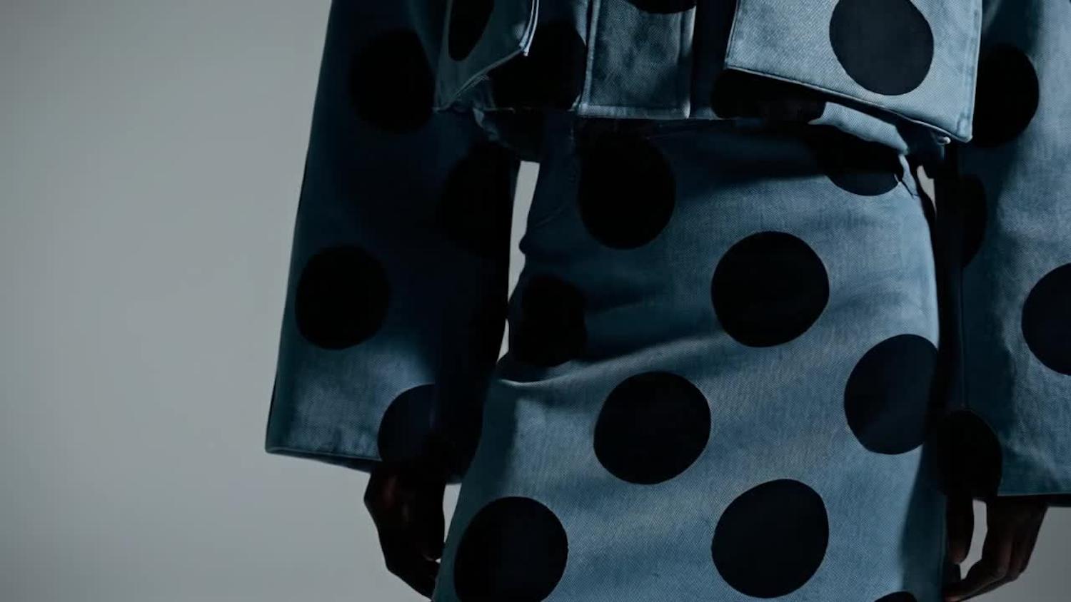 Close-up of a denim outfit with bold black polka dots, featuring a jacket and skirt, set against a neutral background.
