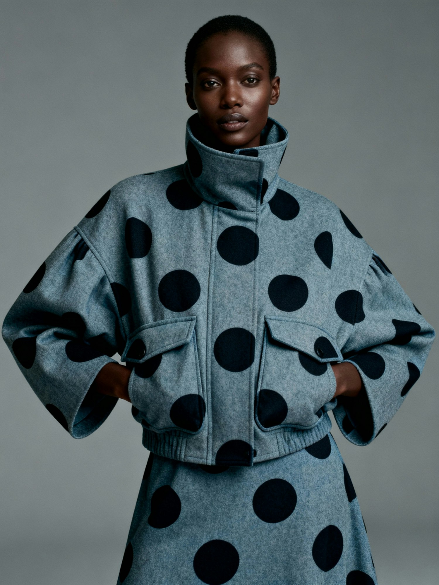 A close-up editorial portrait of a poised Black woman wearing a voluminous, oversized jacket and matching outfit adorned with large black polka dots on muted blue-gray fabric. The jacket features a high collar, wide sleeves, and large pockets, paired with a matching dress or skirt in the same bold textile. Her glowing, hyperrealistic skin contrasts beautifully with the cool-toned palette and graphic pattern. The plain background is a soft slate gray — chosen to harmonize with both her skin tone and the outfit’s visual rhythm. Lighting is soft and diffused, enhancing texture, silhouette, and editorial impact.
