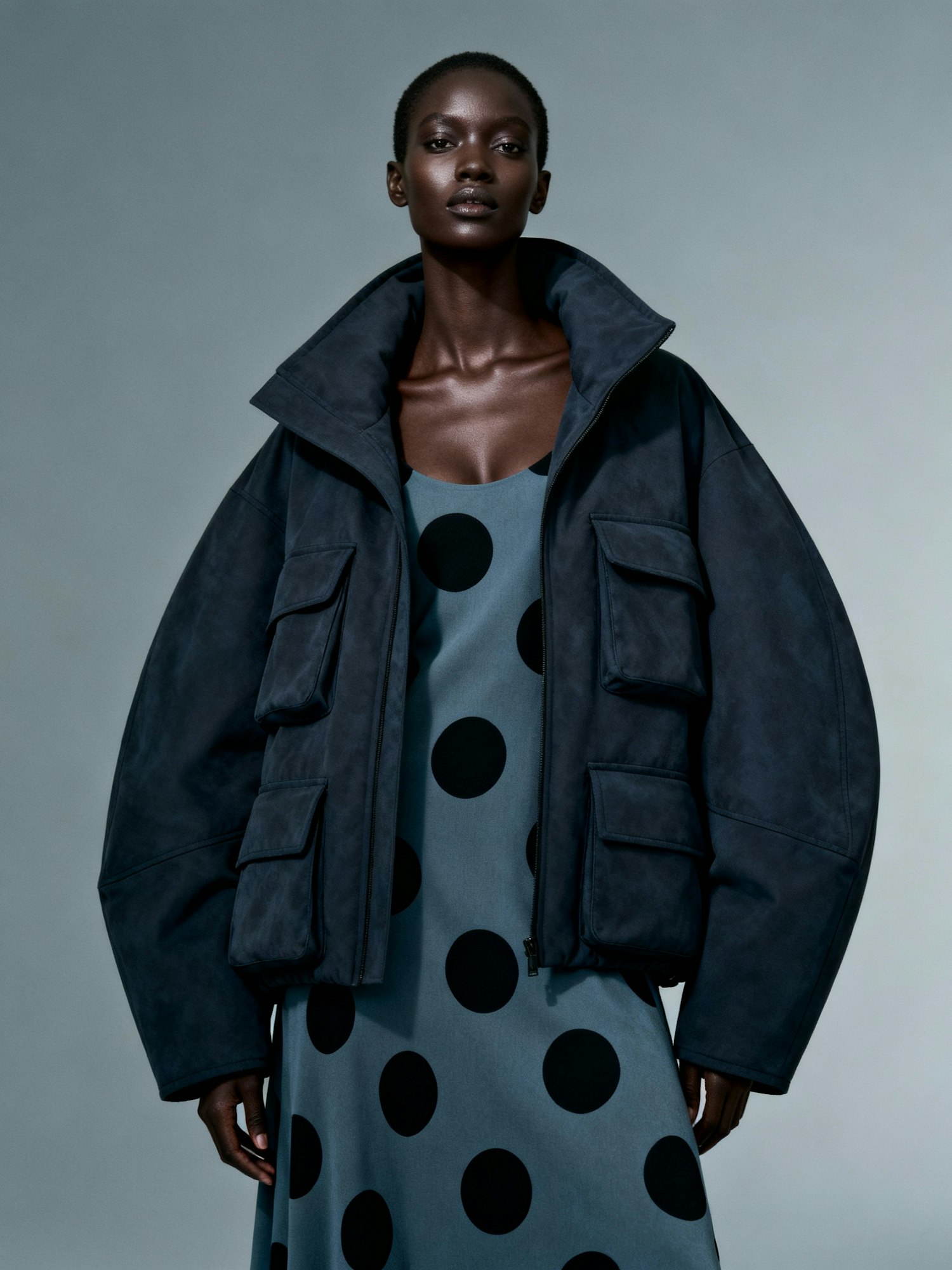 A close-up editorial portrait of a poised Black woman wearing a voluminous, oversized jacket and matching outfit adorned with large black polka dots on muted blue-gray fabric. The jacket features a high collar, wide sleeves, and large pockets, paired with a matching dress or skirt in the same bold textile. Her glowing, hyperrealistic skin contrasts beautifully with the cool-toned palette and graphic pattern. The plain background is a soft slate gray — chosen to harmonize with both her skin tone and the outfit’s visual rhythm. Lighting is soft and diffused, enhancing texture, silhouette, and editorial impact.
