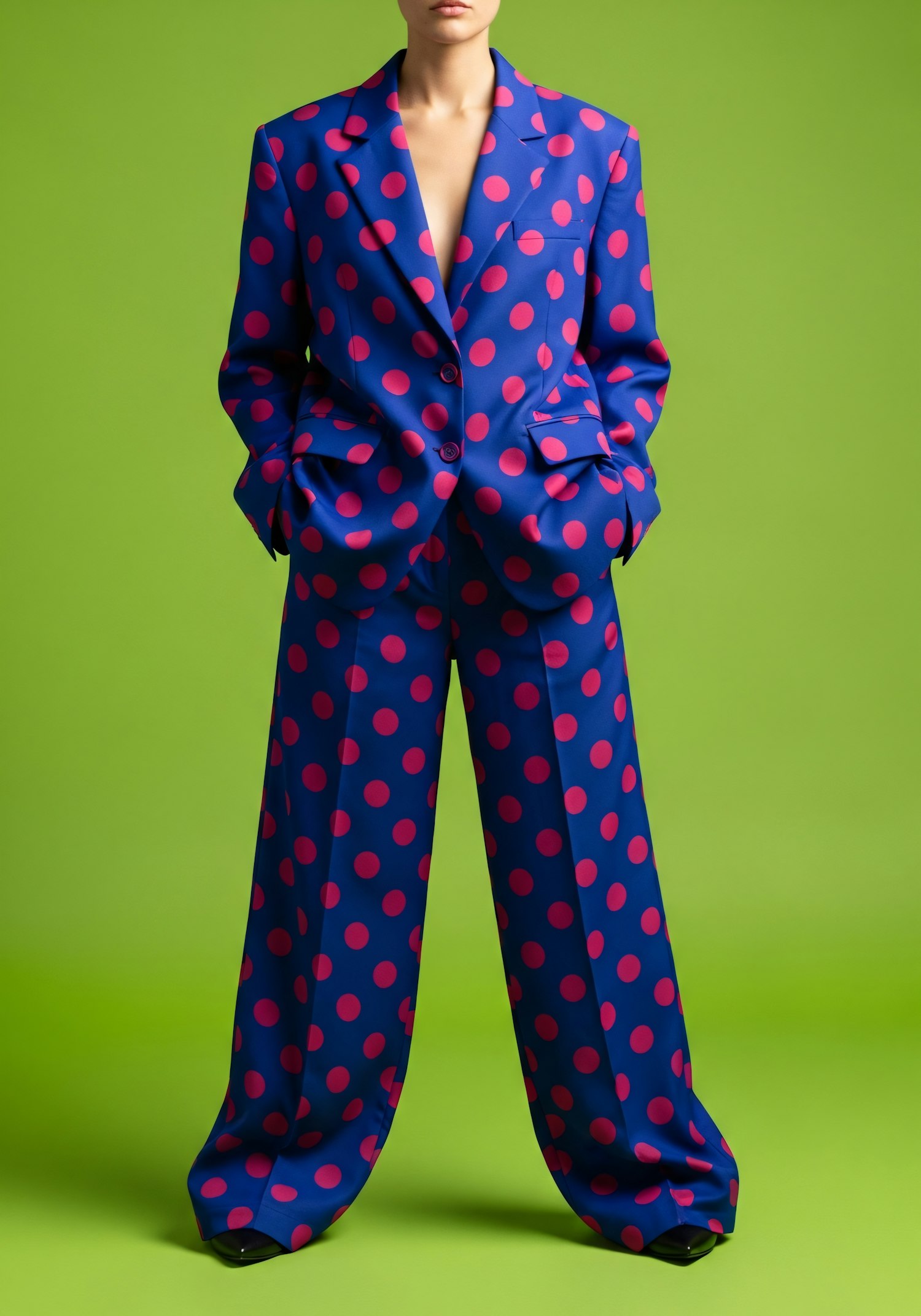 A vibrant blue suit with pink polka dots against a green background, showcasing bold fashion and striking color contrast.