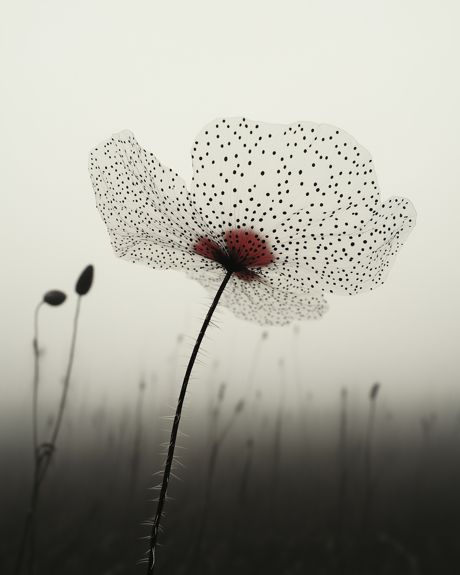 Delicate flower with translucent polka-dotted petals and a pink center against a misty background, creating a dreamy atmosphere.