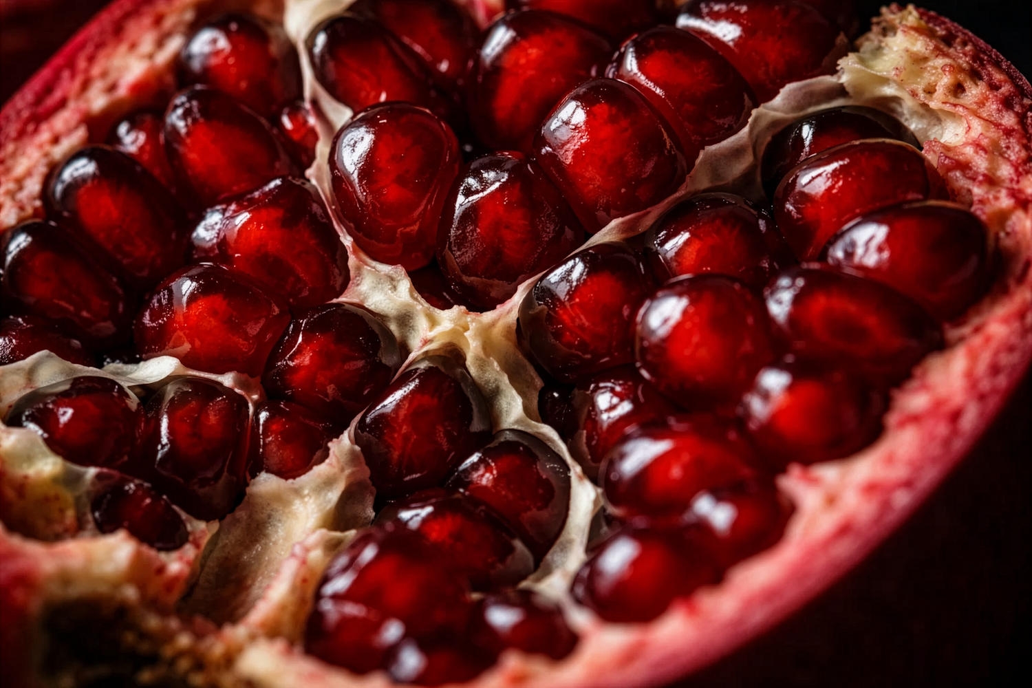 Close-up of a pomegranate's vibrant red seeds, showcasing their glossy texture and the intricate details of the fruit's interior.