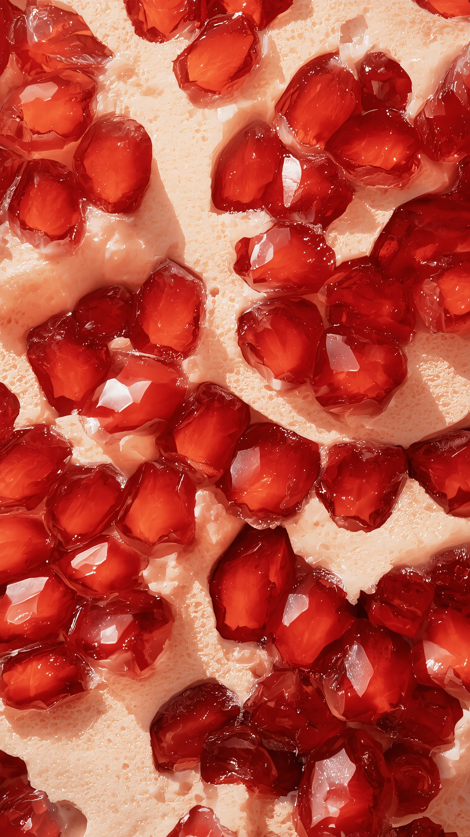 Close-up of glossy red pomegranate seeds on a creamy beige surface, showcasing their vibrant color and jewel-like texture.