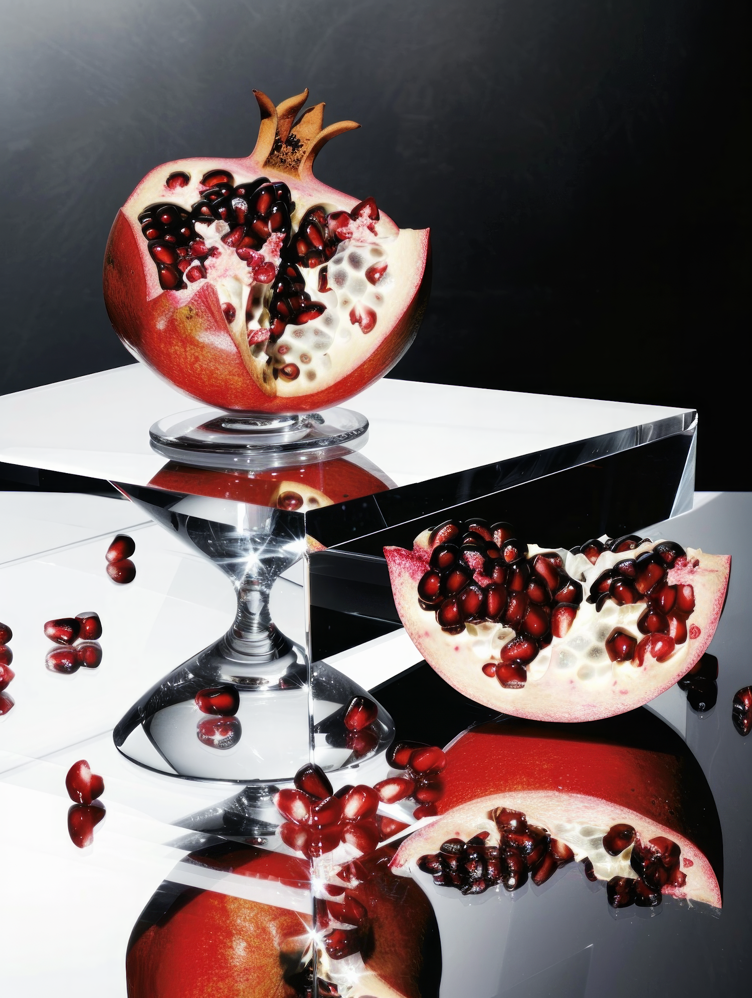 A pomegranate split open on a reflective surface, showcasing its vibrant red seeds and creating a striking visual with light and reflections.