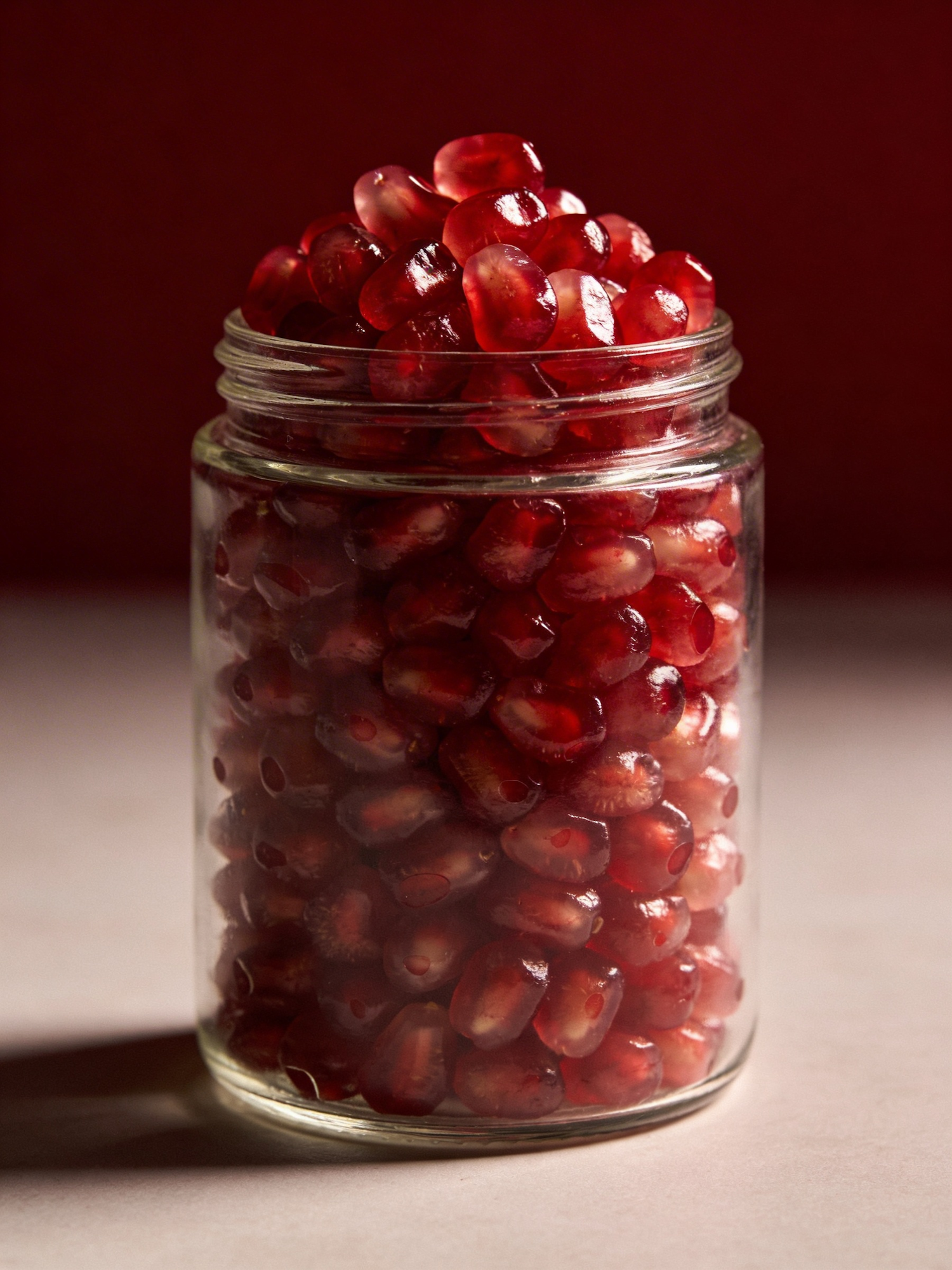 A cinematic still‑life of pomegranate seeds in a glass jar, centered against a rich crimson backdrop. Sculptural lighting, crisp texture, Scandinavian quiet luxury, 8K sharp focus, no text.