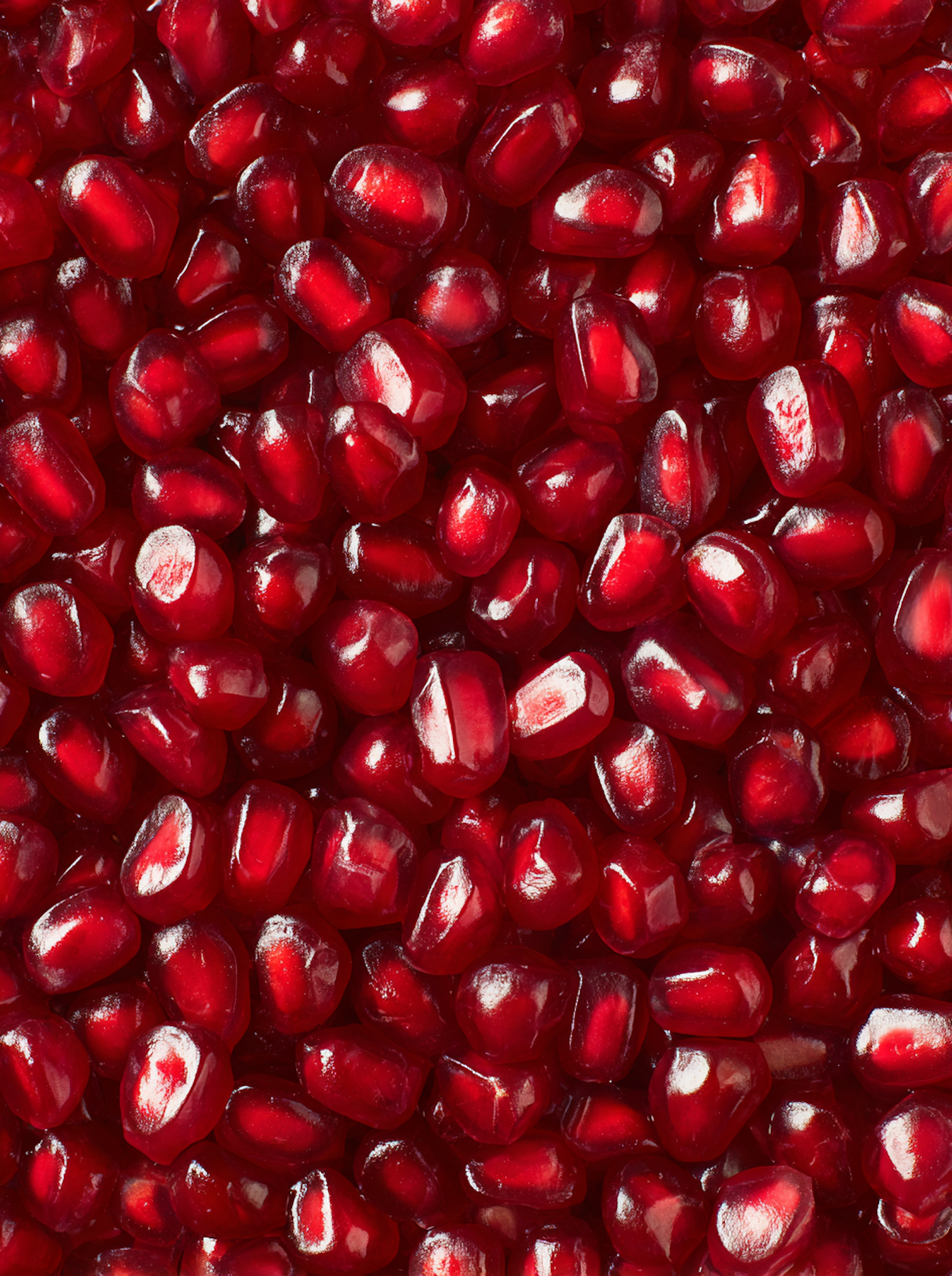 Close-up of vibrant red pomegranate seeds with a glossy texture, showcasing their natural beauty and freshness.