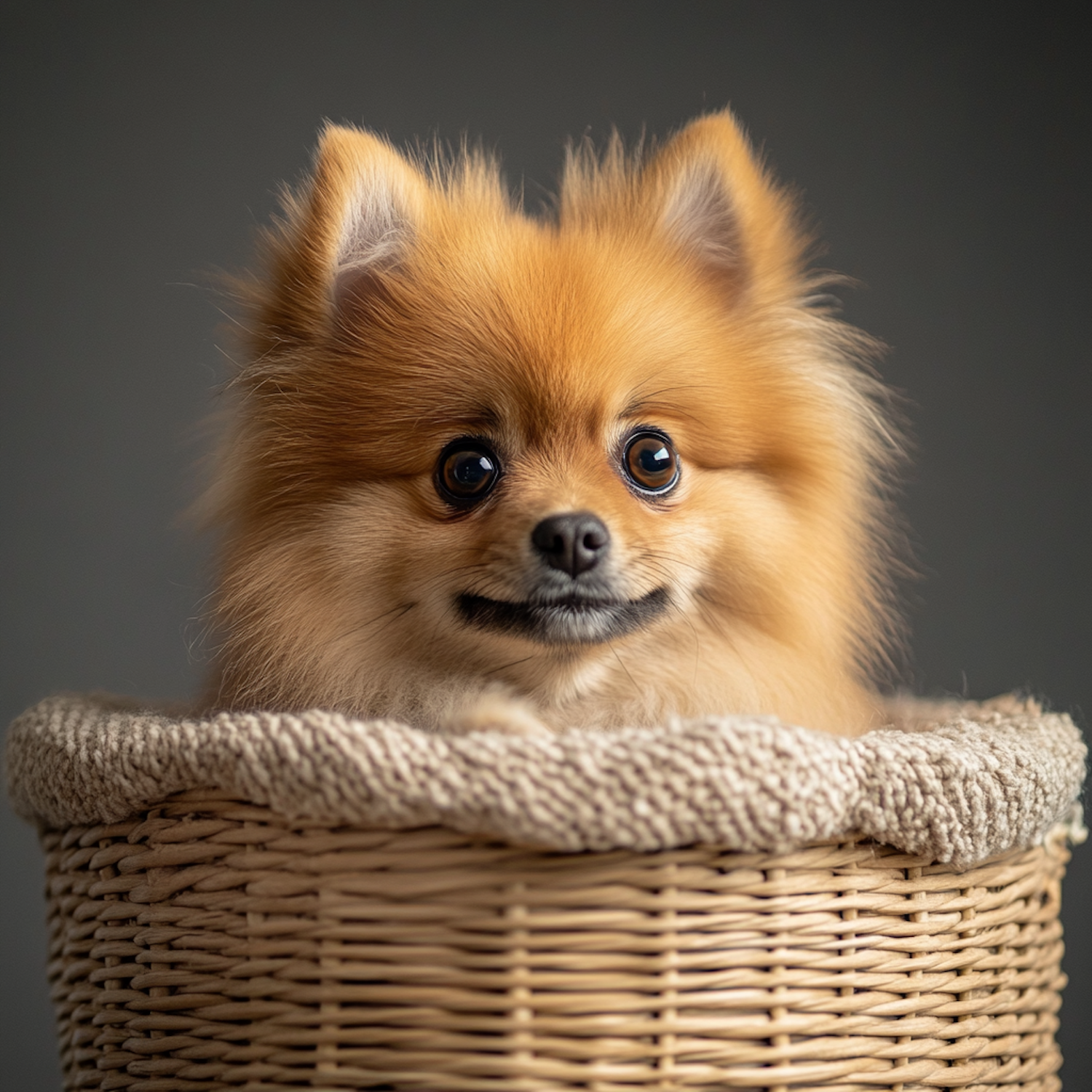 Adorable Pomeranian with fluffy golden fur sits in a cozy wicker basket, exuding warmth and charm against a neutral background.