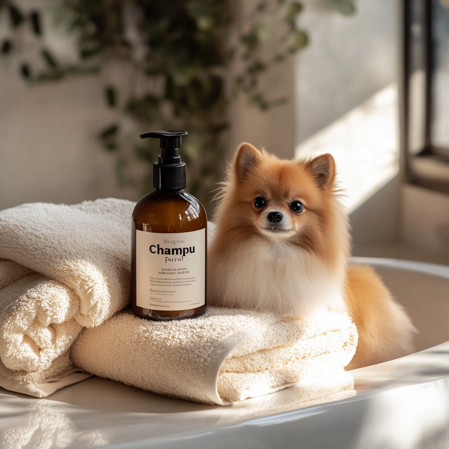 Adorable Pomeranian on soft towels with a bottle of "Champu Pure" shampoo in a sunlit bathroom. Perfect for pet grooming inspiration!