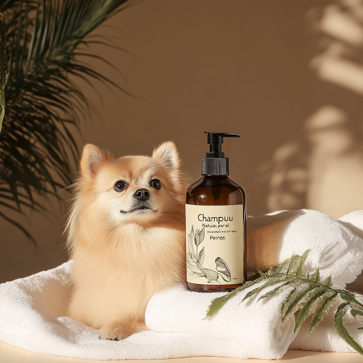 Adorable Pomeranian with golden fur sits by a natural dog shampoo bottle on white towels, surrounded by warm tones and botanical accents.