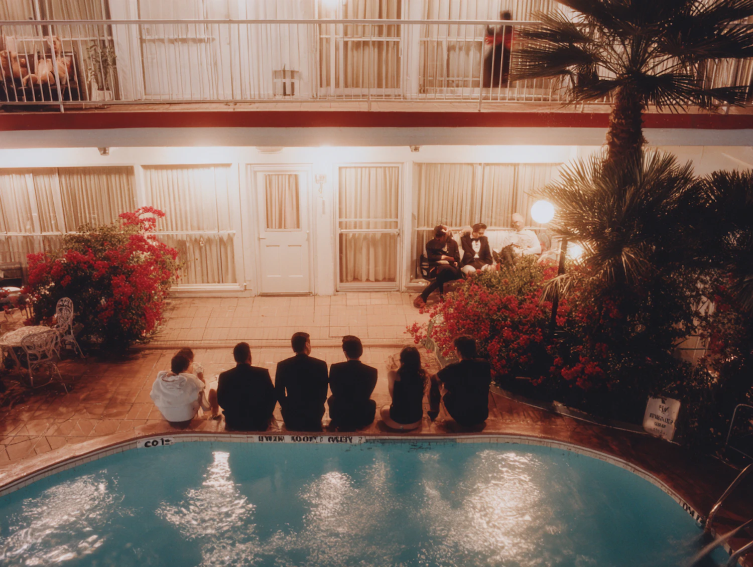 A nighttime scene of people sitting by a pool, surrounded by warm lighting, red flowers, and a motel-like structure in the background.