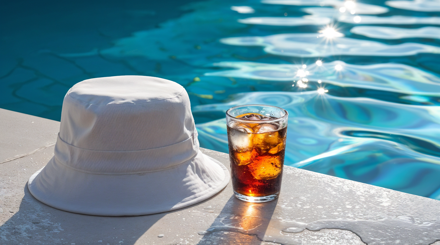 Relaxing poolside scene with a white hat and a refreshing iced drink, set against sparkling blue water.