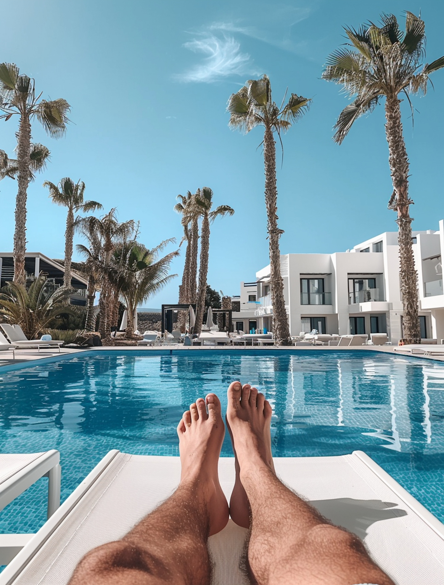 Relaxing poolside view with palm trees and modern resort buildings under a clear blue sky.